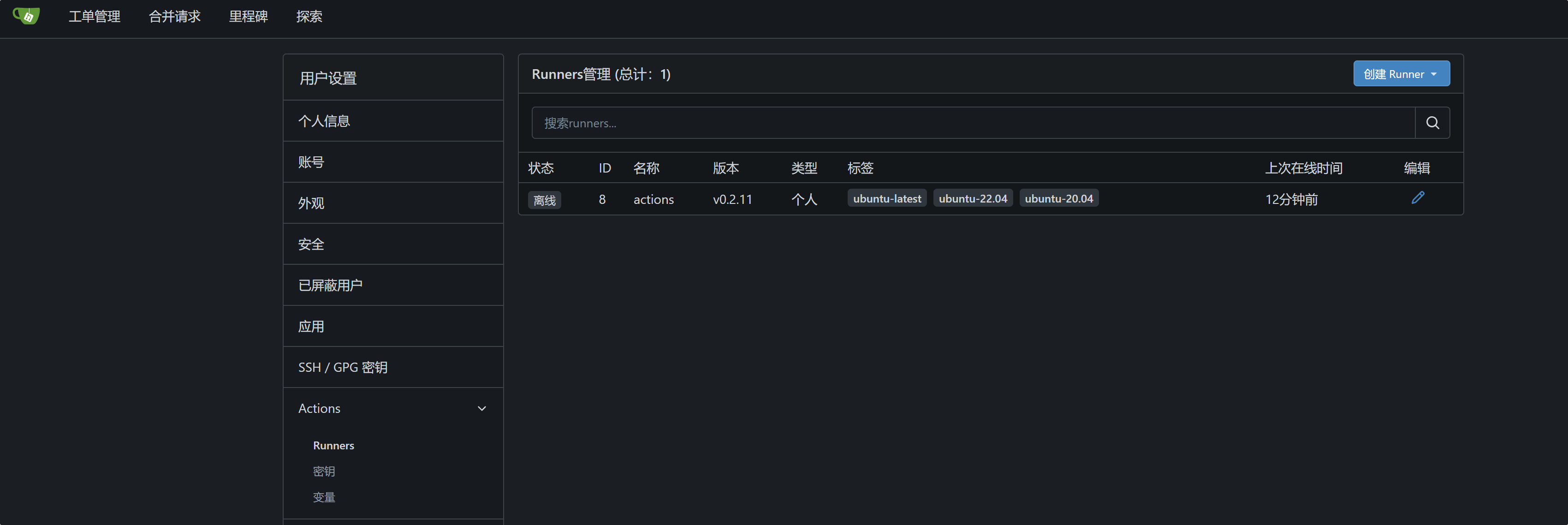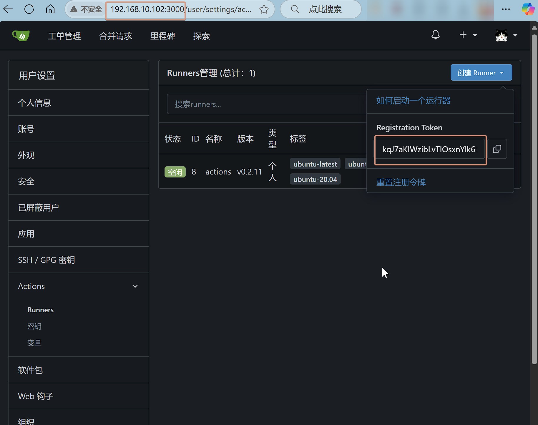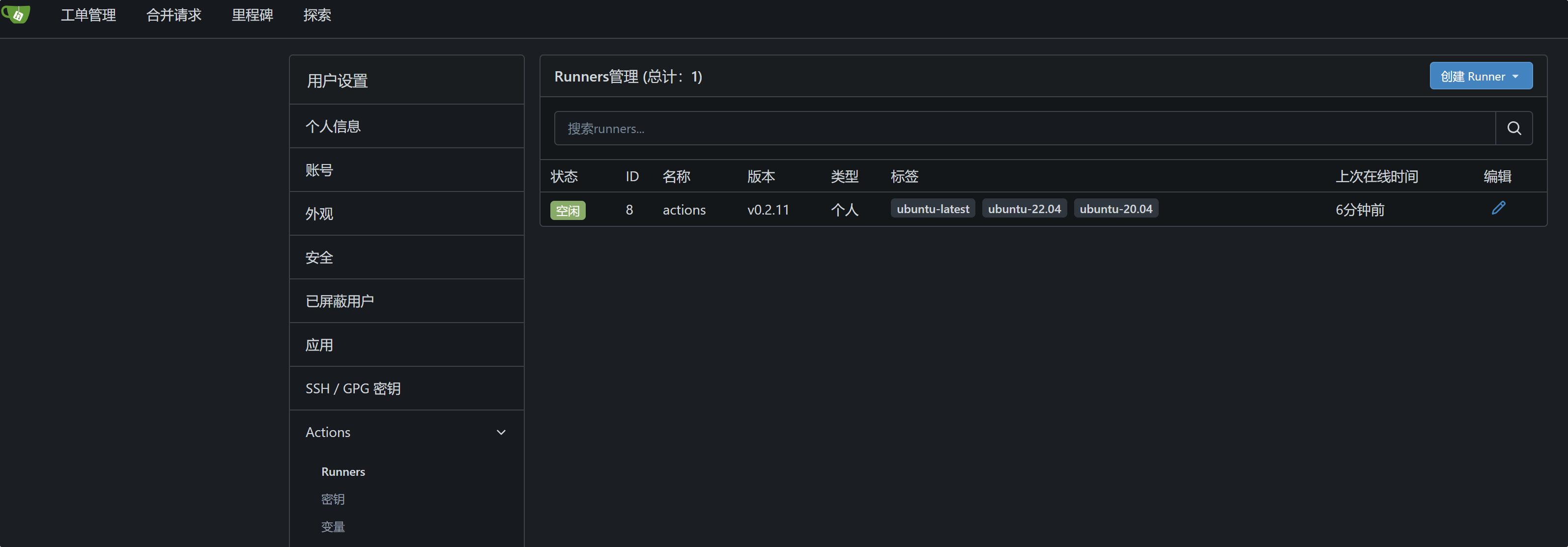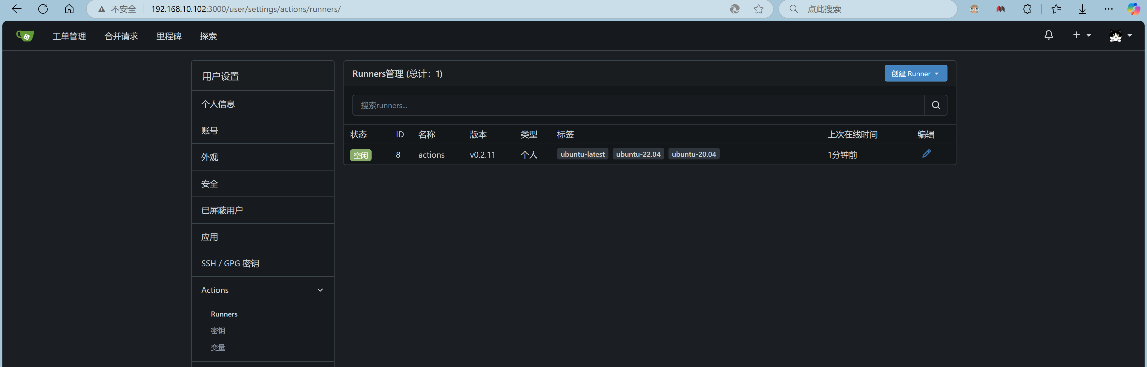 登录 Gitea 服务器,可以在 Acitions 中看到刚才启动的 Runner,它处于空闲状态。