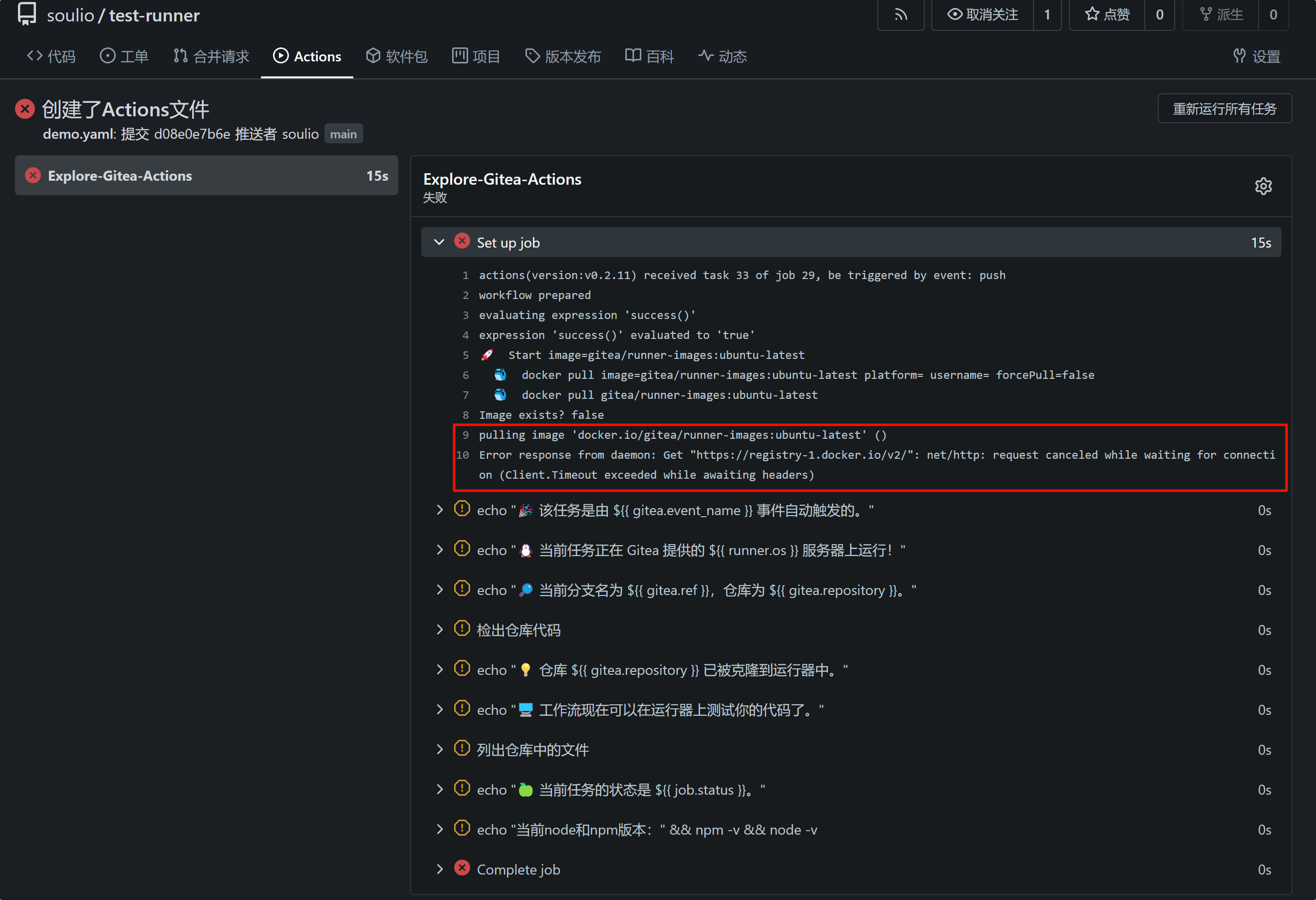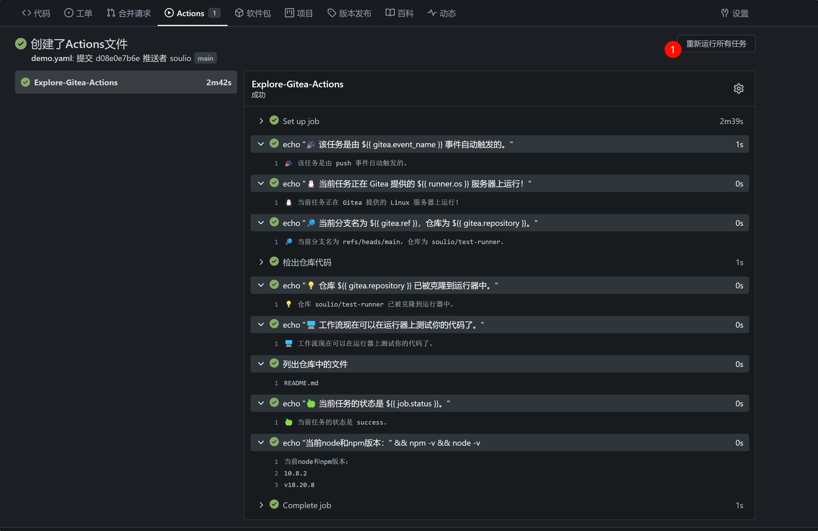 - run: echo "🐧 当前任务正在 Gitea 提供的 ${{ runner.os }} 服务器上运行!"
