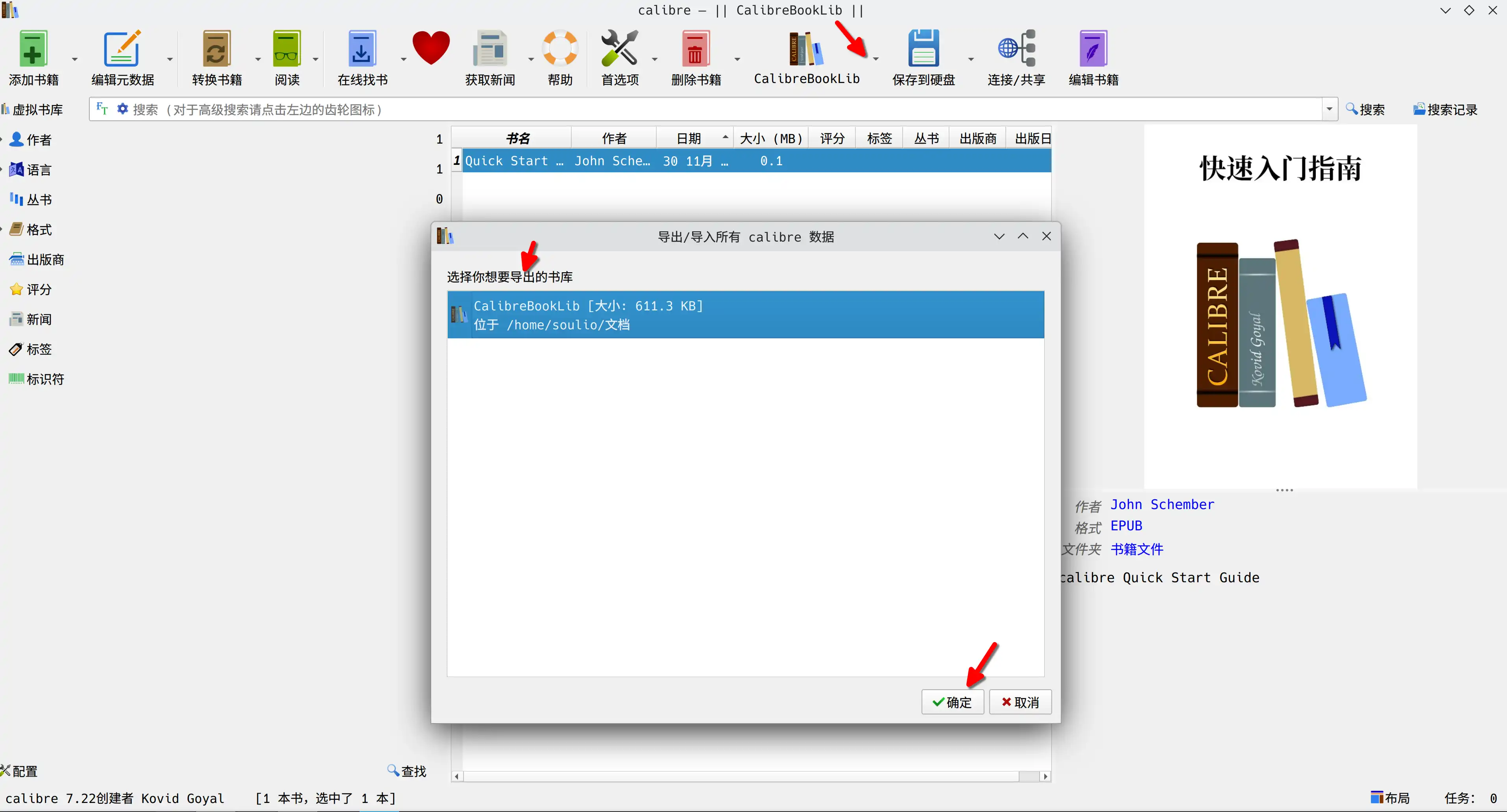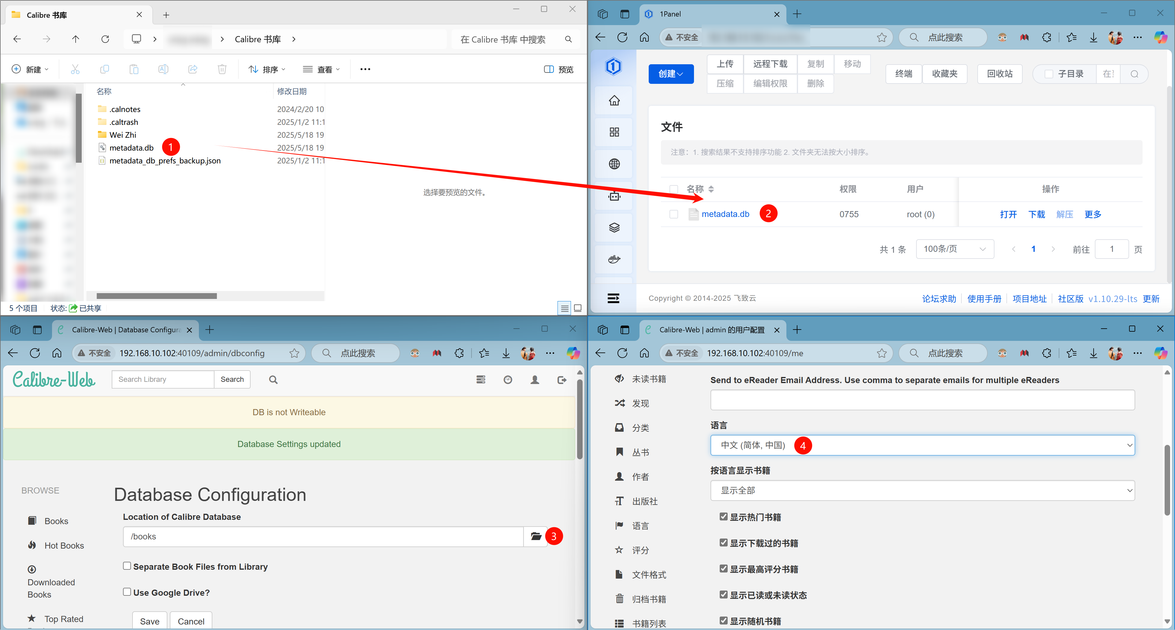 第一,打开桌面版 Calibre 安装目录,复制 metadata.db 到Calibre服务器 /books 目录。第二,访问 Clibre-Web,选择 DataBase 目录为 /books,保存成功。第三,点击右上角 头像 图标,选择语言为中文。