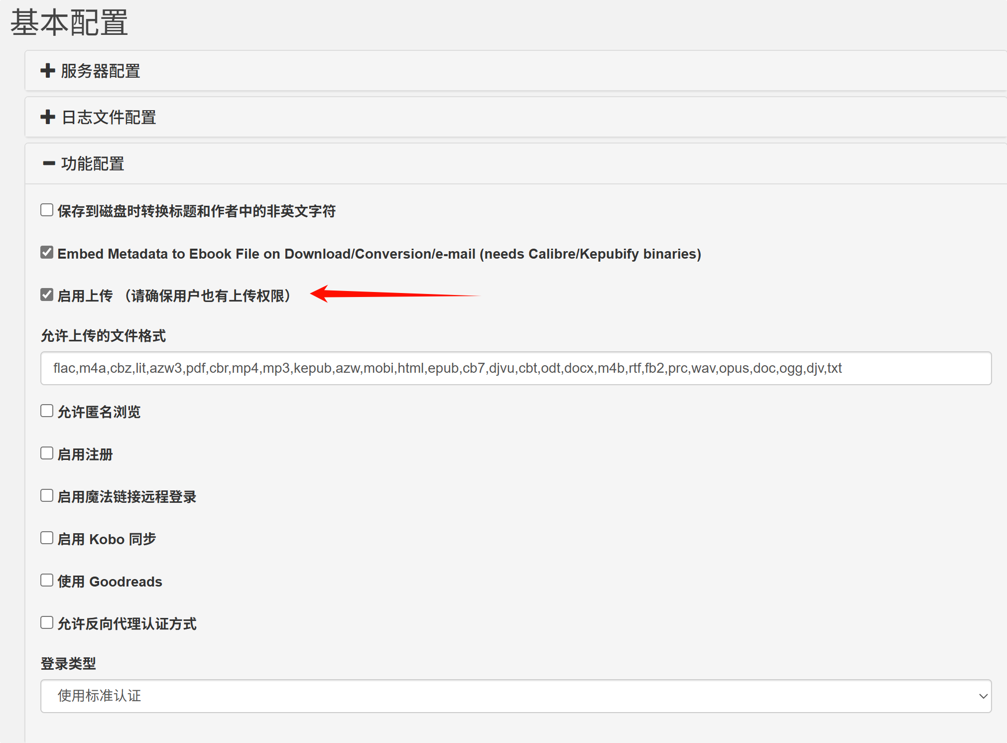 第二,开启上传功能。基本配置中允许上传。