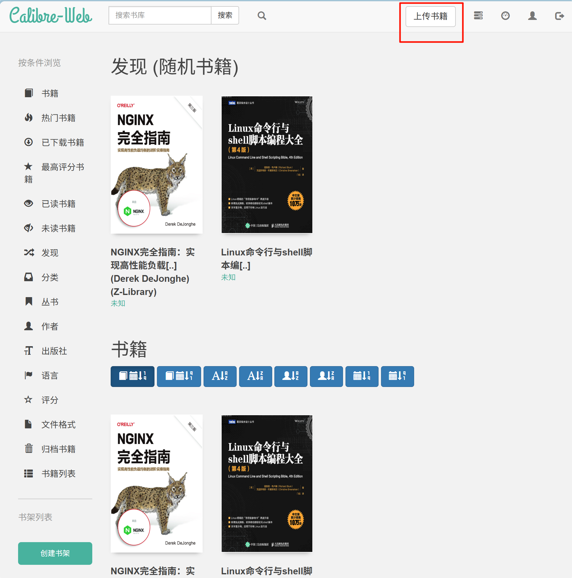 - 上传后,Calibre-Web 会自动索引文件,并支持分类、标签和搜索。