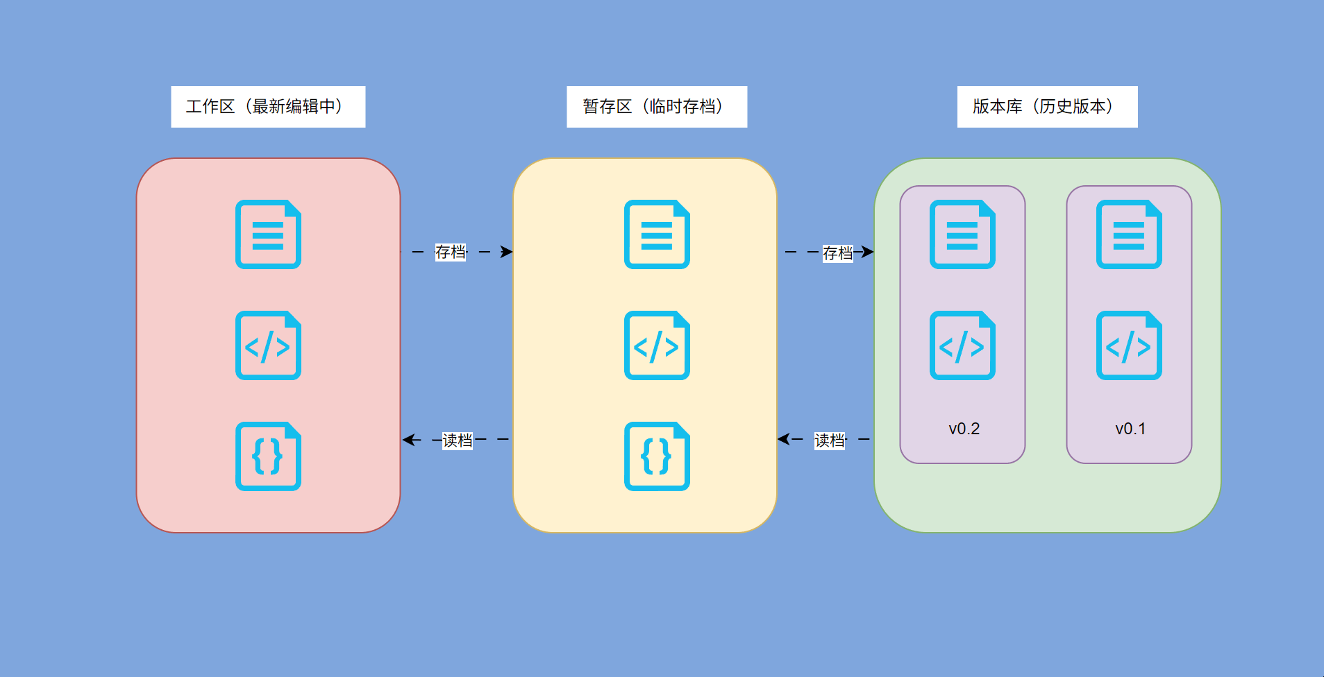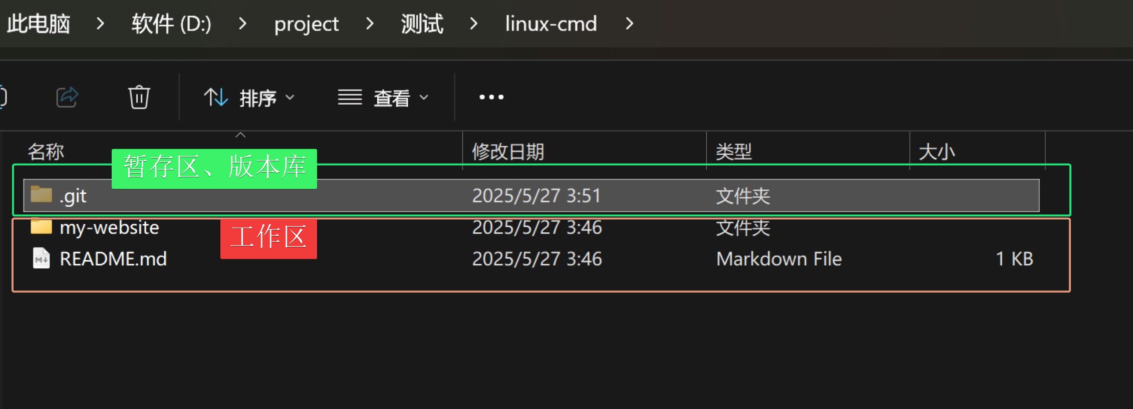 此处的 my-website/和 README.md 就是工作区,被 Git 管理,存在历史快照。当你不小心改乱了其中的文件,可以通过 Git 命令回到某个历史版本!