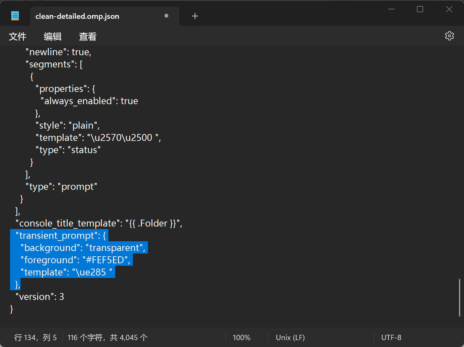 打开 主题.omp.json 文件,找到 "transient_prompt" 或 "segments" 中含有提示符符号的 "template" 字段。