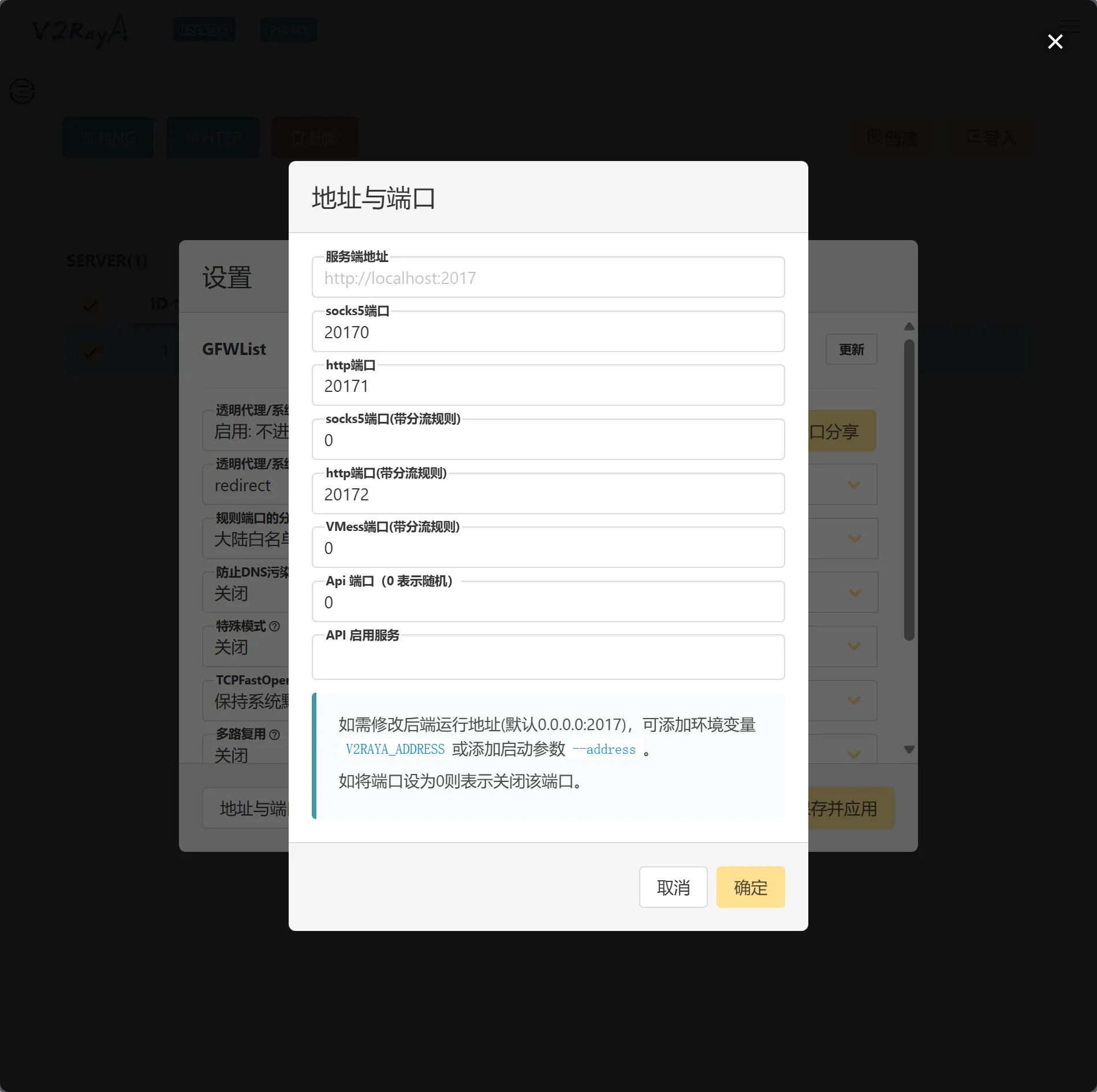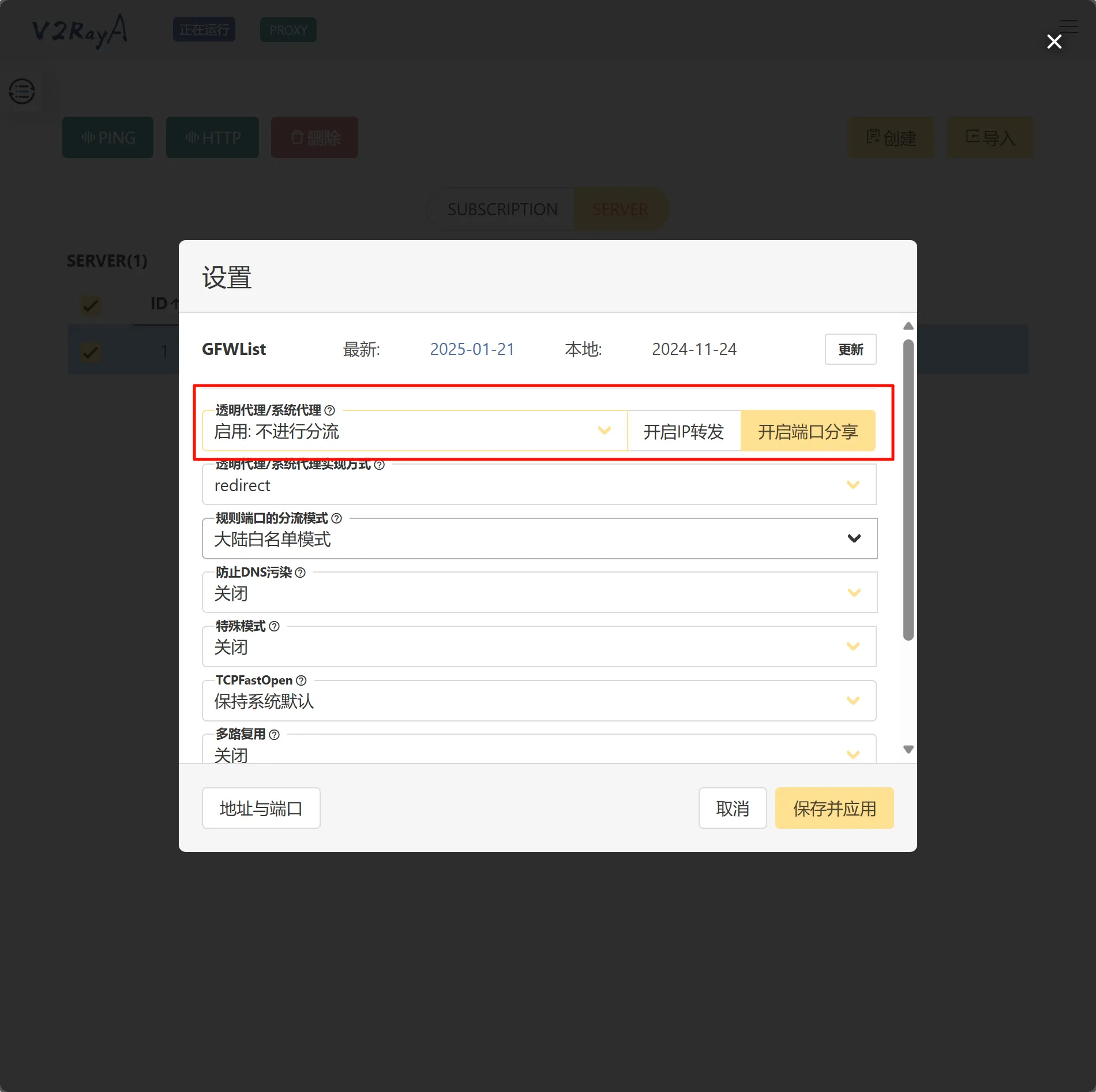 打开设置,启用任意一种代理模式(不进行分流)。开启端口分享,让局域网内的设备可以使用v2rayA代理。