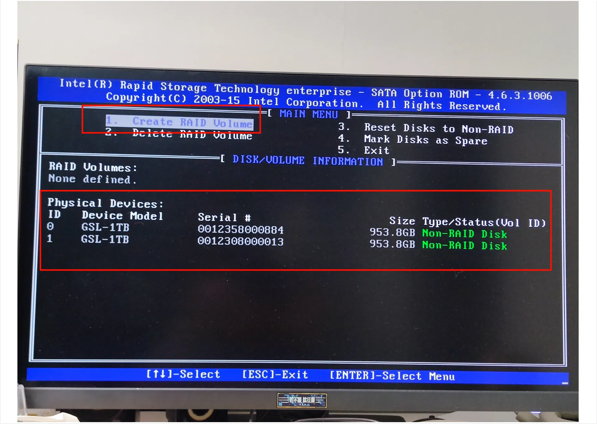 - 查看界面:进入RAID管理界面可以看见两块1T固态硬盘,以及