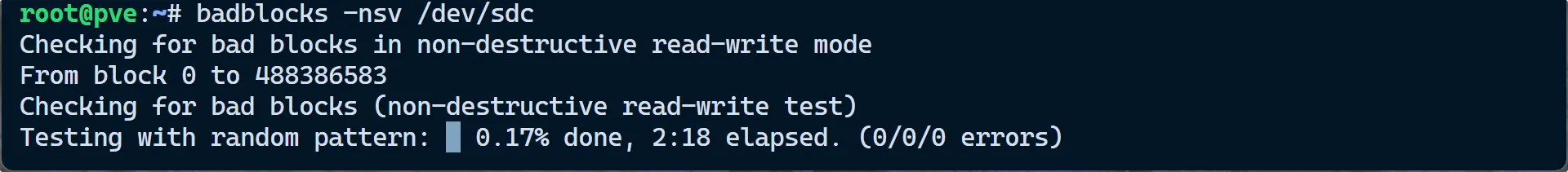 sudo badblocks -sv /dev/sda > badblocks.txt