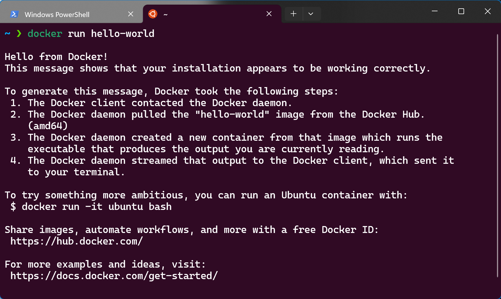 hello-world 是一个简单的 Docker 应用,它的大小只有几KB。当它运行成功时会在屏幕上输出一段欢迎语,如此用户便能确认 Docker 的确安装成功了。