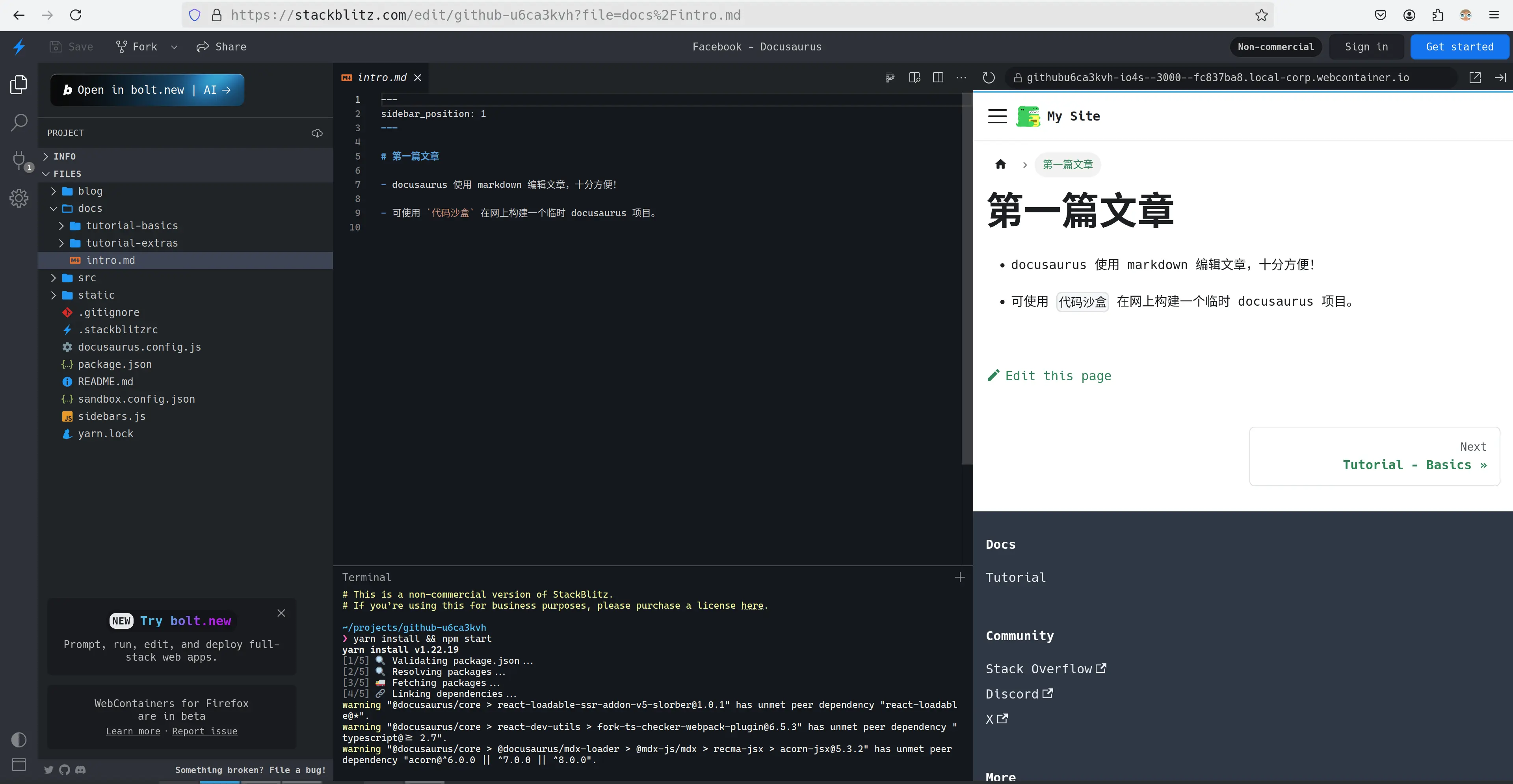 Docusaurus入门笔记上手使用intro本页总览introDocusaurus 是一个静态网站生成器,可以基于你的 Markdown 文档生成静态网站。生成网页的样式美观大方,适合文档类网站。 演示 这些网站使用 Docusaurus 构建 快速上手 通过 在线Demo 试用 Docusaurus。 官方文档 了解更多: Docusaurus 官方文档