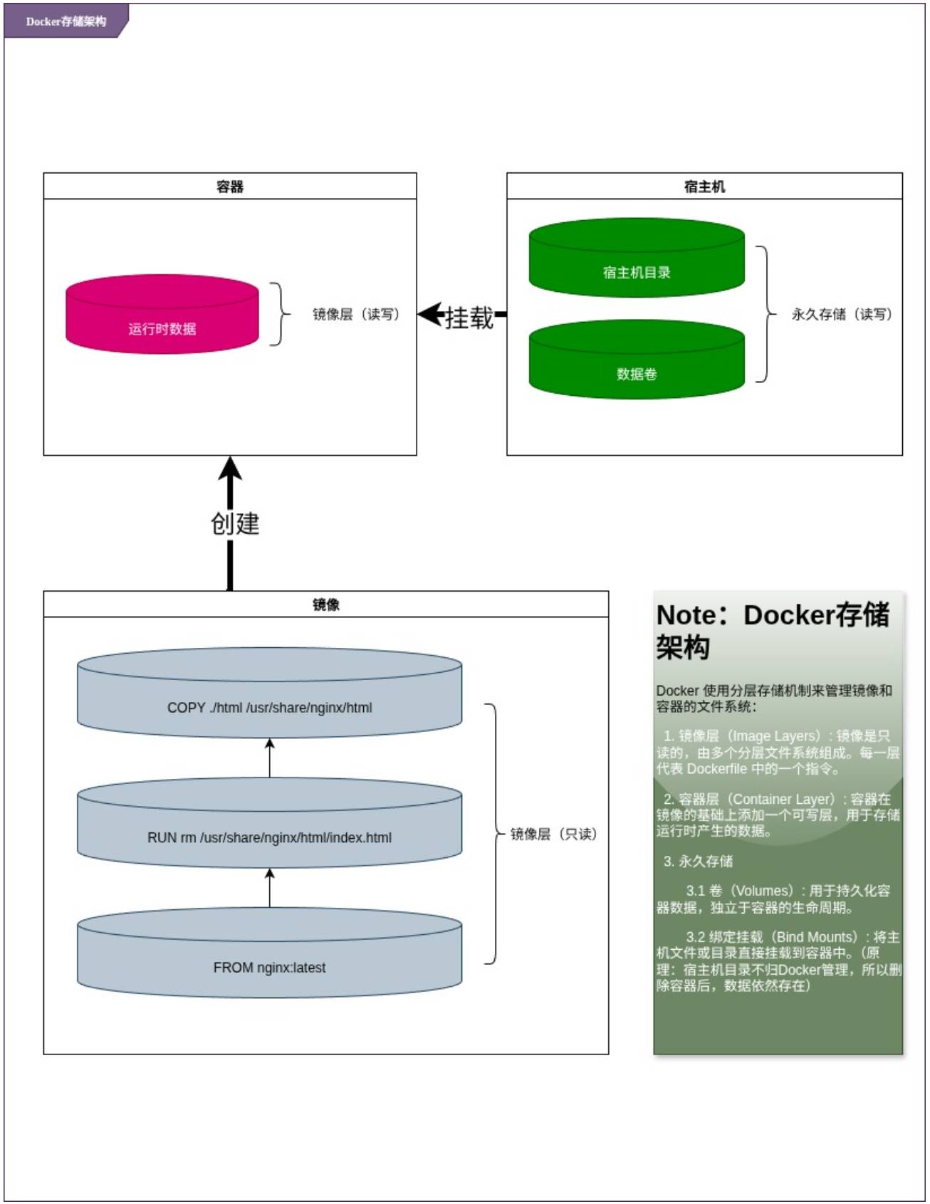 Docker 存储管理是 Docker 容器化技术中的重要部分,涉及镜像、容器、卷(Volumes)和绑定挂载(Bind Mounts)等的存储管理。在使用命令管理 Docker 存储之前,我们先了解 Docker 存储架构。