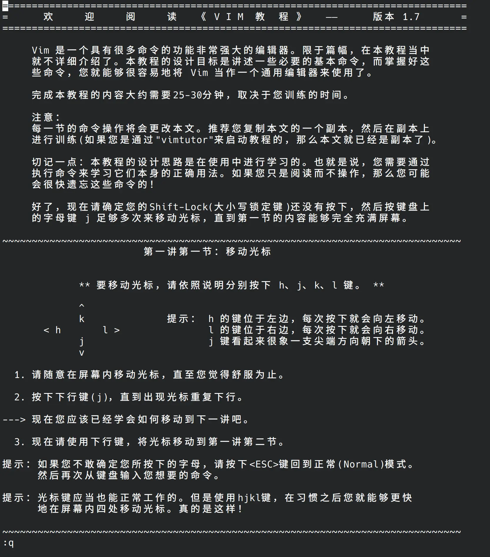 vimtutor 是 VIM 自带的教学工具,使用命令 vimtutor 启动教程,通过实操逐一完成教学章节。