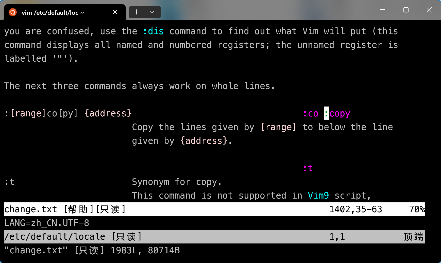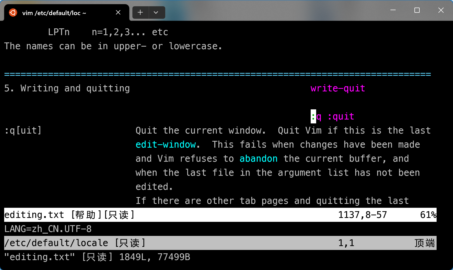 :help copy:查看复制命令的帮助。:help :q:查看退出命令的帮助。