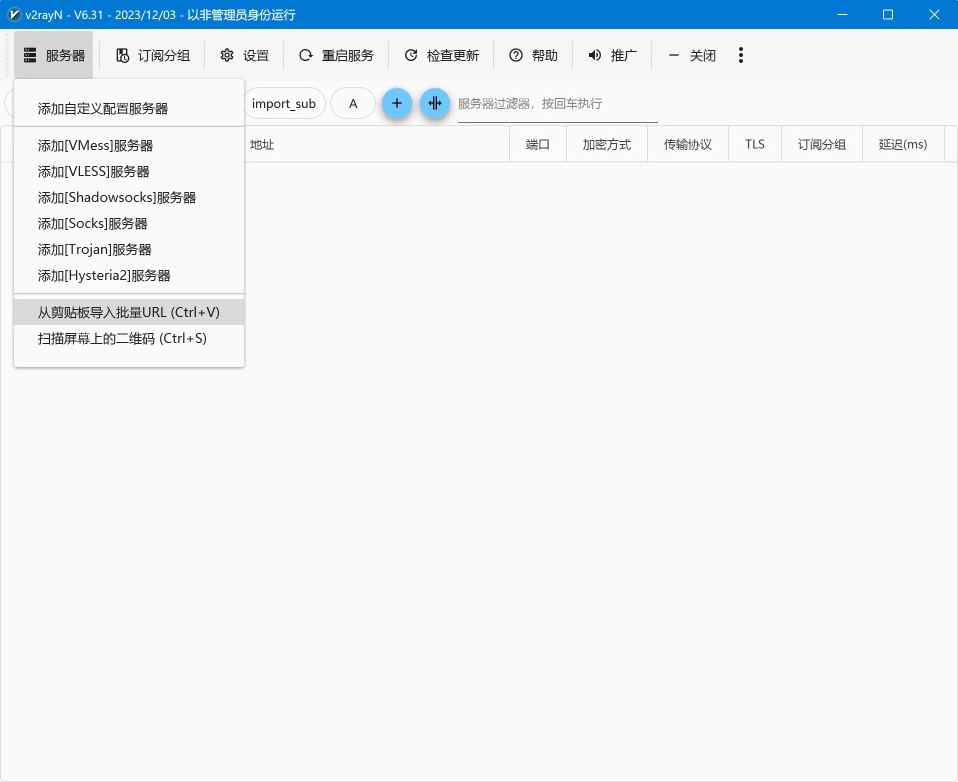 打开v2rayN > 服务器 > 从剪贴板导入批量URL